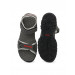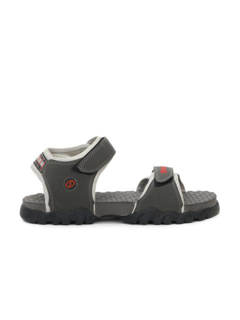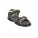 Grey round toed sandal with forefoot straps and ankle loops (that have Velcro closures and a pull loop)