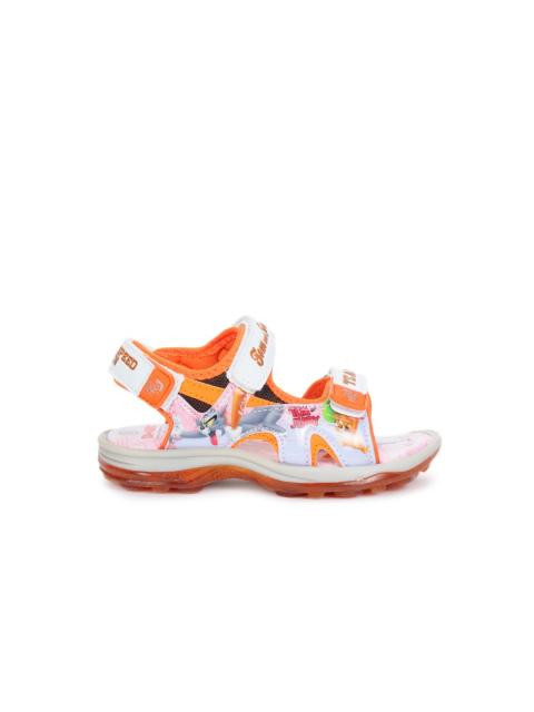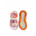 White sandals with velco straps at the forefoot, midfoot and heel region, and orange piping along the straps