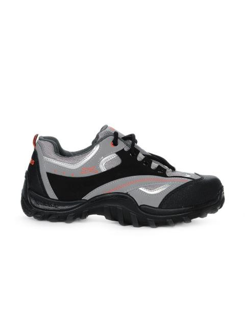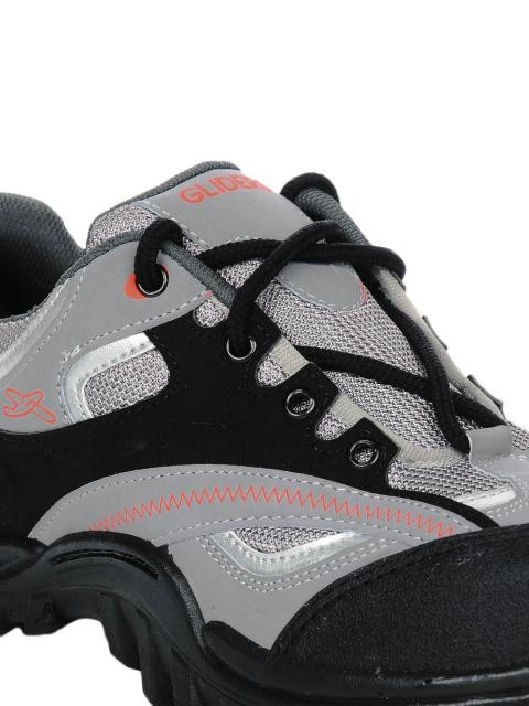 Thick rubber outsole extending in front to form a toe guard and at the back to form a heel guard, has multi directional lugs for improved grip and traction