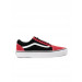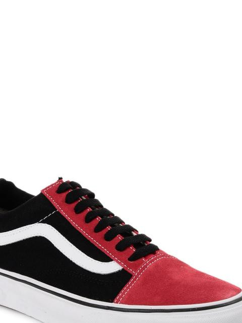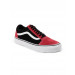 Black and red, round toed shoes with central lace up fastening