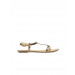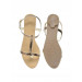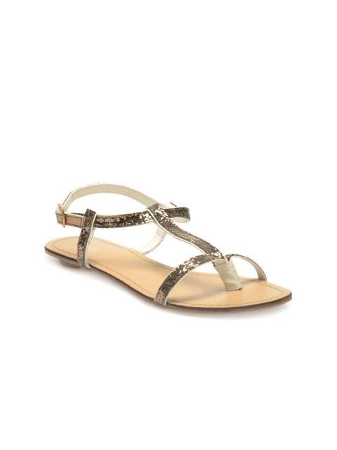 Open toed flats with dark copper sequin detailing on the straps, has a forefoot strap, a toe separator and a buckled ankle loop