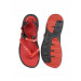 Red sandal with thong style straps, a toe separator, a midfoot strap fastened by a click clock closure and an ankle strap