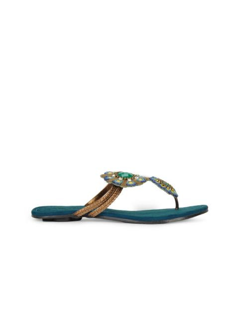 Bronze thong style strap with a toe separator and crystal and beaded floral embellishments
