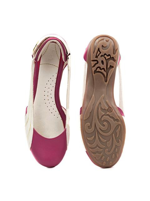Pink and white synthetic ballet flat style upper with a velcro closure on the heel collar