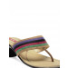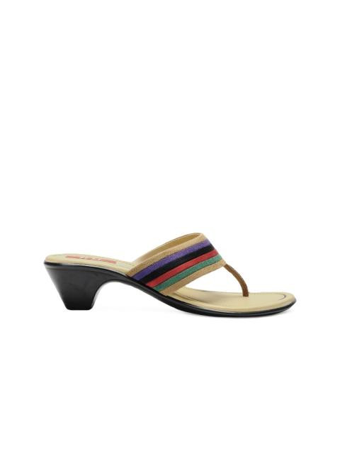 A pair of open-toed heels with a thong style upper, multicoloured midfoot strap