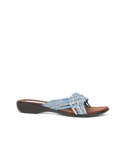 Criss-crossing forefoot straps in silver and blue with shimmer detail all over, extends up to the heel