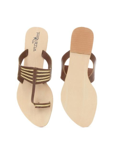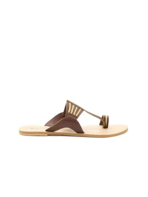 Open toed brown flats with gold accents, has a toe holder, a midfoot strap and a connecting strap between the two
