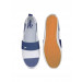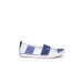 Blue and white striped slip-on with synthetic upper, a rubber strap on the midfoot with branding and a haul loop at the heel counter