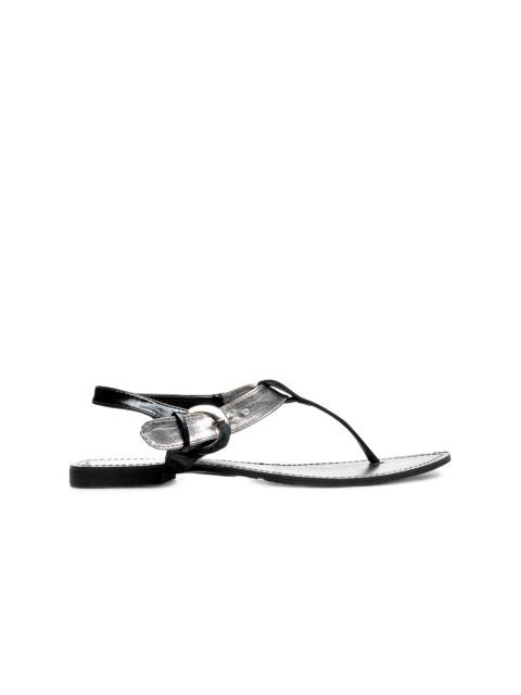 Black and silver flats, open-toed, thong style upper and a buckled ankle loop