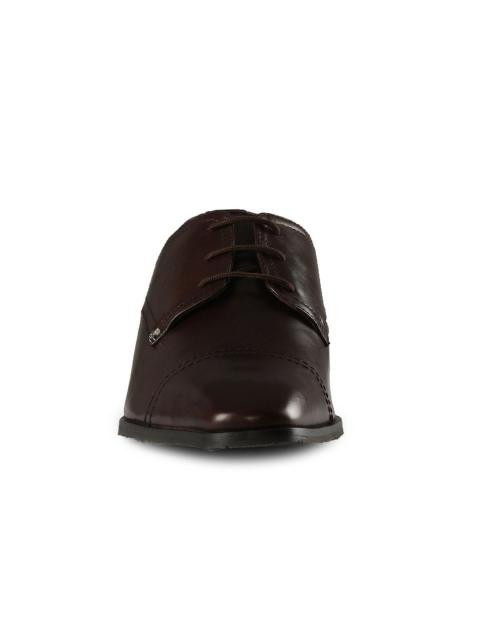 Slight twist on the classic three-hole lace-up shoe with a clean, slim silhouette and a refined stacked heel, by arrow for men. The extra stitch detailing on the toe box of this narrow derby shoe gives it more interest – the shoe is a sartorialist's reinterpretation of the classic Derby. Wear this shoe crafted from Italian leather with slim Fit formal shirts and trousers.