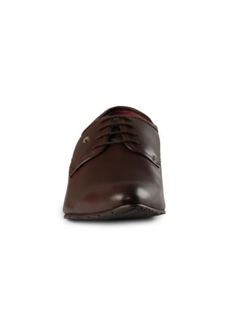 Classic five-hole lace-up shoe with clean, slim silhouetting and a refined stacked heel, by arrow for men. The strategic stitch detailing on this narrow derby shoe is a sartorial dream. The shoe is a minimalist's reinterpretation of the classic Derby. Wear this shoe crafted from Italian leather with slim Fit formal shirts and trousers.