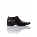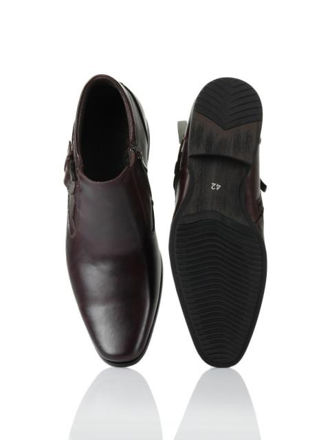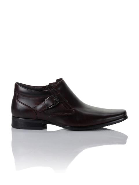 Synthetic leather upper with overlay and stitched detail, has a strap with buckle detail on the side, zip closure on the left side, reinforced heel collar