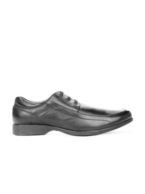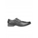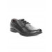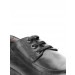 Black, round toed shoes with central lace up fastening and an upraised heel