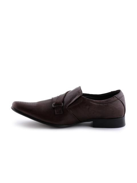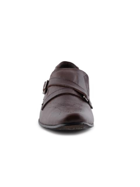 Classic tapering monk-strap shoes from provogue for men with a refined, stacked heel. Mild brogue detailing on the toe box on this slim silhouetted shoe gives a fun, casual vibe to this formal shoe. Wear this with tonal, structured trousers and a crisp shirt and a leather jacket.