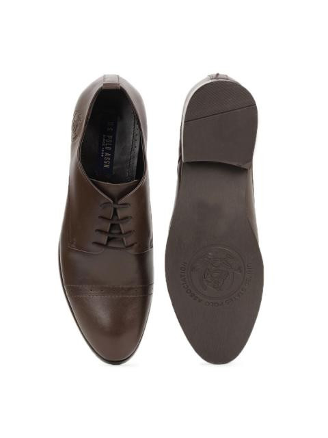 Style NoteReferencing the classic derby boot, this pair of U.S. Polo Association shoes is a great formal wear option - they're hard wearing but look smart. Add a raffish feel to your on-duty ensemble with these shoes, they'll look good with denims, a tee and a plaid shirt.Product DetailsBrown derby shoe with perforations on the toe box, central lace-ups and a haul loop at the heel collarPadded tongue and innerOutsole adhered to the upper for durabilityTPU outsole with branded groove on the forefoot and a stacked heelMaterial and CareLeatherWipe with a clean dry cloth to remove dustUse a leather conditioner and a brush for added shineStyle Note