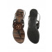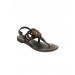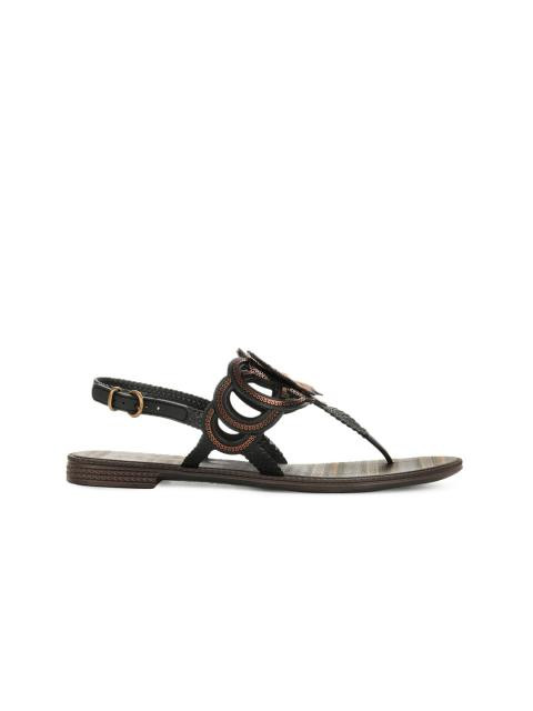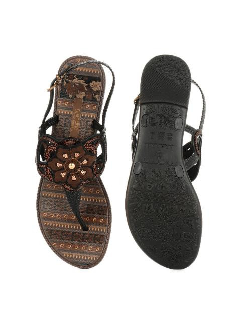 A pair of round-toed, black thong style plastic straps with a flower embellishment on the centre