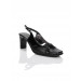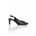 Synthetic leather upper with a square front and glossy ankle straps with a buckle closure
