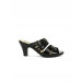 Has a black heel with a black and beige footbed