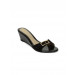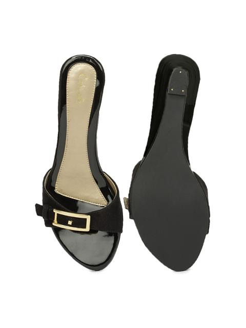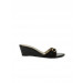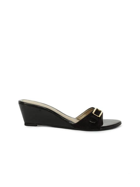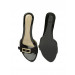 Black sandal with synthetic suede strap with golden buckle detail on the forefoot