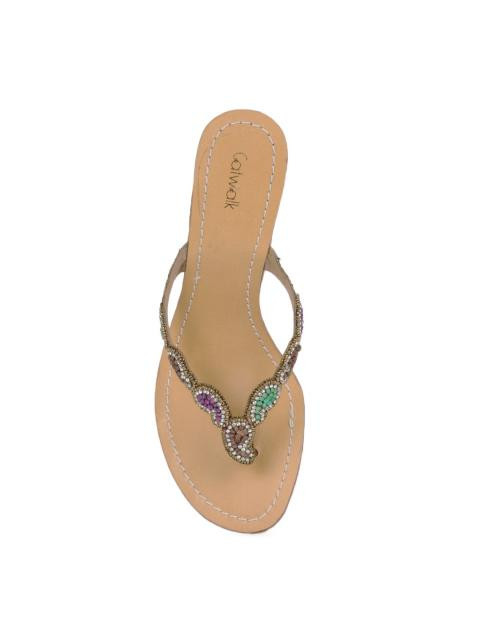 Blunt toed sandals with a thong style strap with crystal and gem embellishments