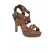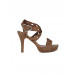 Pointy toed high heeled sandal with wood toned forefoot straps and criss-crossing midfoot straps that loop around the ankle