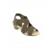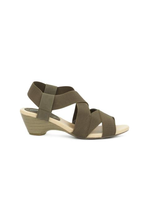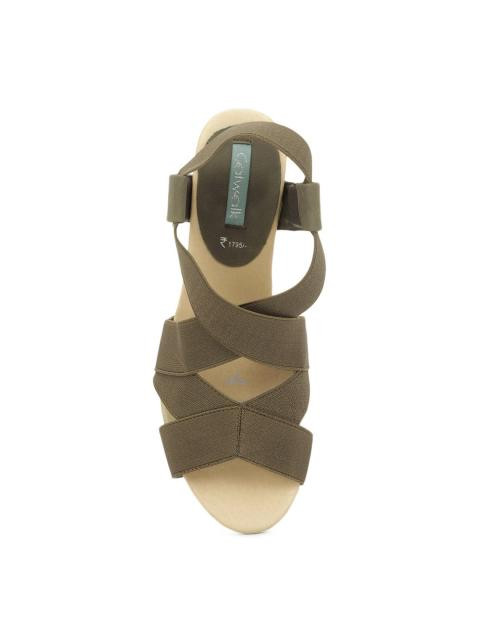 Tapering toed sandal in beige with olive green elasticated forefoot and midfoot straps (that loop around the ankle)