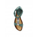 Blunt toed sandals with a teal strap at the forefoot and an ankle loop with a zipper