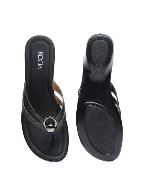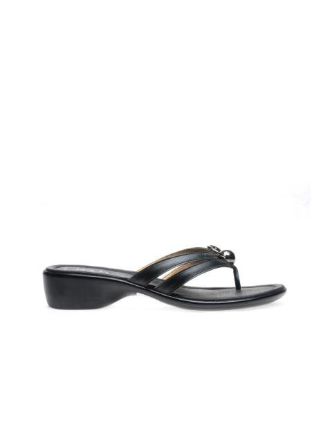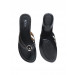 Black sandals, open-toed, thong style upper and a metal link at the apex of the straps