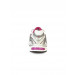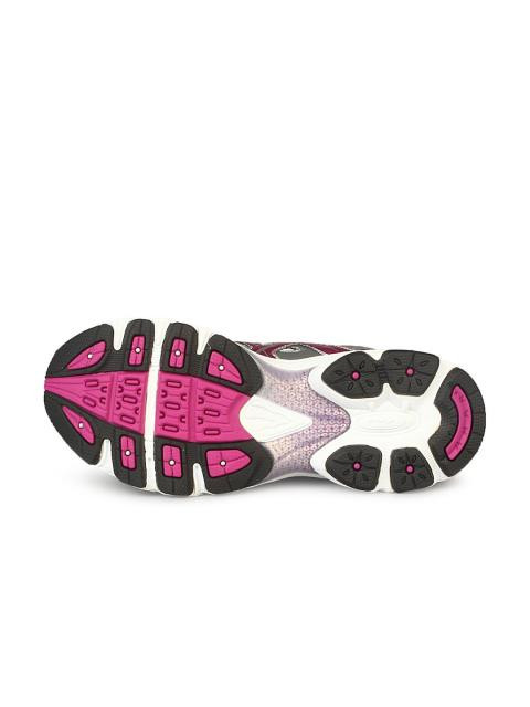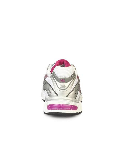 Grey and pink running shoes with anti-microbial properties, trusstic system, open mesh upper, rear foot cushioning with GEL Cushioning system and outsole with AHAR