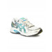 Silver and blue synthetic leather running shoes with synthetic leather and mesh upper, rearfoot GEL cushioning system, lightweight midsole, trusstic sole unit and solid rubber outsole with AHAR