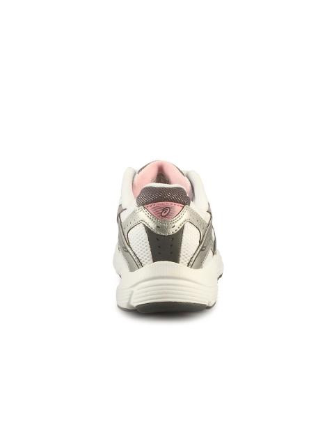 White and pink running shoes in synthetic leather with mesh upper, reflective material, California slip and solid, high abrasion rubber outsole with GEL Strike 2 technology