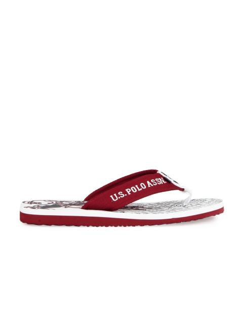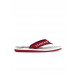 Red flip flop with thong style fabric straps with a fabric toe separator