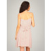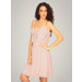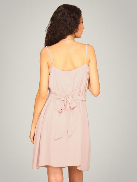 Dusty pink strappy dress made of 100% silk with 100% polyester lining in the same colour, with ruffled bib, thin adjustable shoulder straps, concealed zipper on the left side and with tie back waist