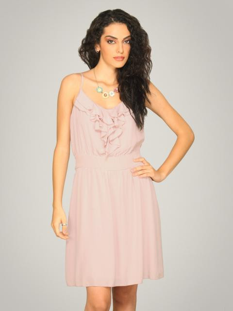 Indulge the girly side in you with this dusty pink dress from forever new. The ruffled bib and the tie back sash infuses this dress with delicate femininity. Team this with silver ballerina flats and a soft white cardigan and a string of pearls for a really fresh look.