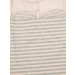 Peach top with peach and grey striped bodice, made of 95% cotton and 5% elastane, with polka dot netting on top of the bodice made of 100% polyester, mock button closure detailing on the back and subtle rouching on the front of bodice