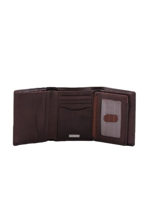 One main compartment on a smoothly textured three-fold wallet with embossed branding and fabric lining