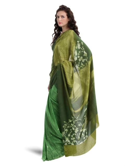 Emerald green saree with screen print, has a printed authenticity label at the waist region (which will be tucked in at the waist after draping the saree)