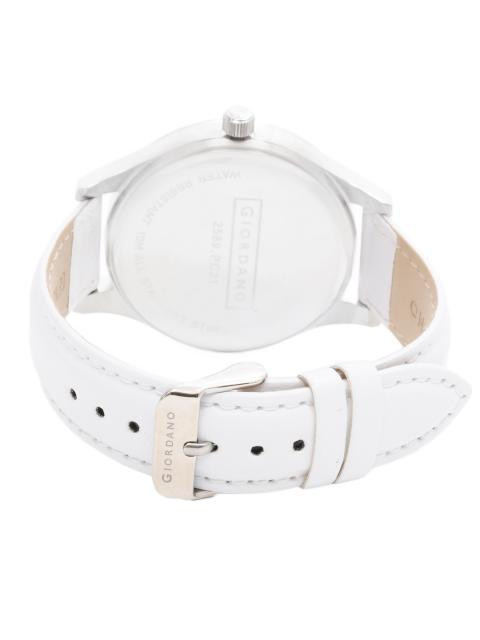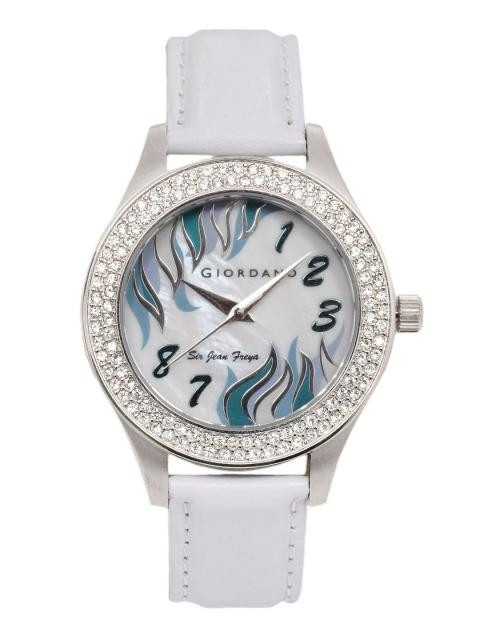 Case style: Stainless steel circular case in silver with studded crystalsDial style: White dial with silver handsStrap style: White genuine leather strap with a tang claspFeatures: Giordano branding on the 12 hour mark and screw to reset timeWater resistant to 10 MWarranty: 2 years