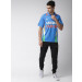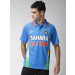 Blue cricket jersey with multicolour panelled accents, has a ribbed collar with contrast stripe, short raglan sleeves, concealed half button placket on front, print detail across chest, and tonal geometric pattern at back