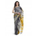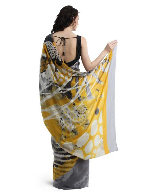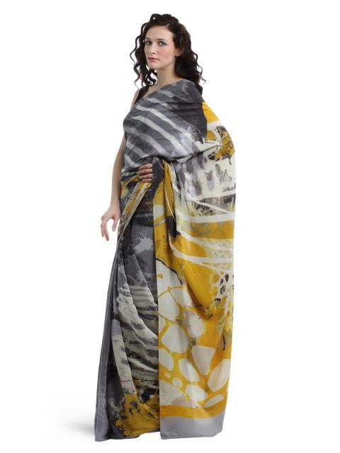 Cream and grey saree with yellow screen print, has a printed authenticity label at the waist region (which will be tucked in at the waist after draping the saree)