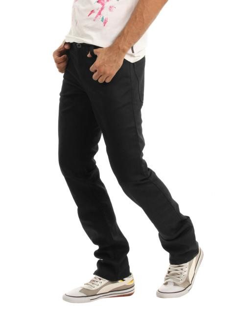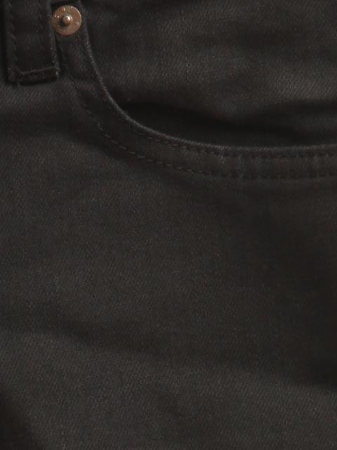 Black jeans, has a button and zipper closure in the front, two insert pockets in front with a coin pocket inside the right pocket, two patch pockets at the back, loops at the waistband, one loop below the waist band at the back to wear a low-slung belt and brand patch on the waistband at the back
