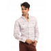 White shirt with pink and purple checks, has a narrow spread collar, a buttoned placket, two buttoned flap pockets at the chest and a curved hem