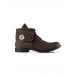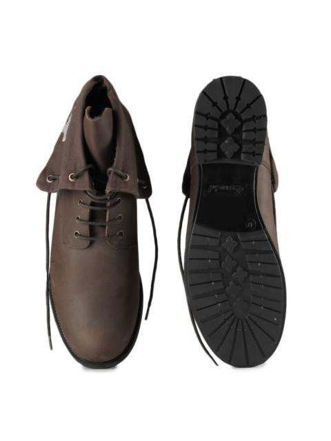 Round toed, brown mid-top chukka boots with a fold-over fabric layer with printed branding (at the mouth)