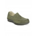 Round toed, olive green, slip-on loafers with stitched detail around the toe box