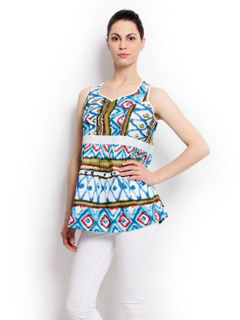 Blue sleeveless printed top made of 100% cotton, has a V-neck and panel stitch at the midriff