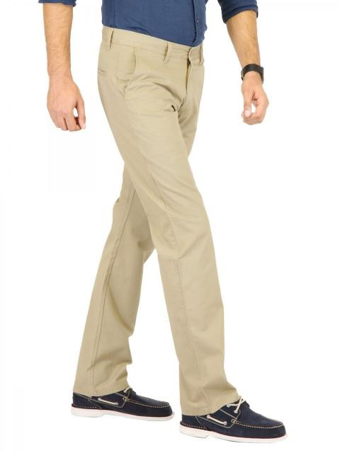 Khaki trousers made of 100% cotton, has two front and two rear button-fastening pockets, and a zipper and button fly