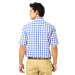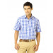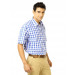 Blue and white broad check shirt made of 100% cotton, has short sleeves, front buttoned placket, pocket on left chest with embroidered brand logo and a curved hemline