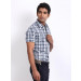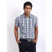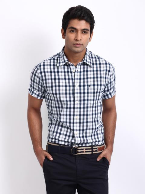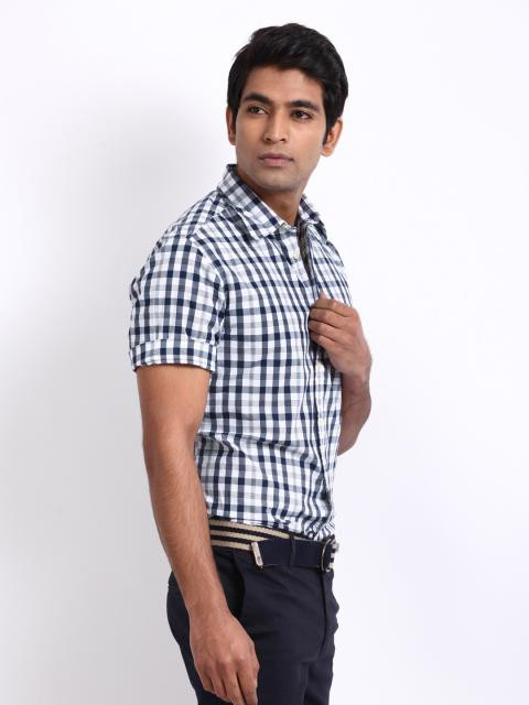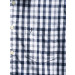 Navy blue and white checked smart-casual shirt, spread collar, short sleeves with mock upturned hems, buttoned placket down front, patch pocket with embroidered branding at left chest, back yoke, curved hemline with contrast inset at sides