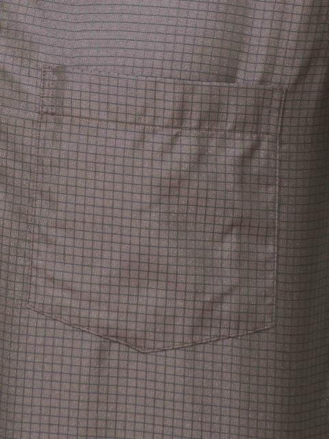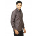 Purple shirt with self checks, made of a cotton blend fabric that has a shiny edge, has a tipped collar with a fabric tape inseam, full arm sleeves with buttoned cuffs, front buttoned placket and pocket on left chest