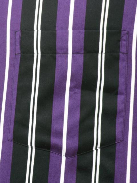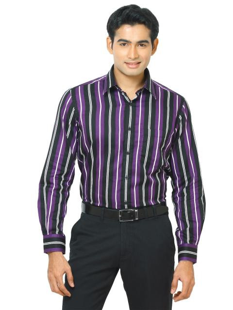 Purple and black striped shirt with white accents, made of 100% cotton, has a tipped collar with a fabric tape inseam, full arm sleeves with buttoned cuffs, front buttoned placket and pocket on left chest
